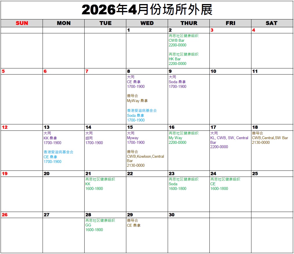 除了可以在以下的机构做HIV测试,有些机构还会在不同场所,提供不定期的外展测试服务。